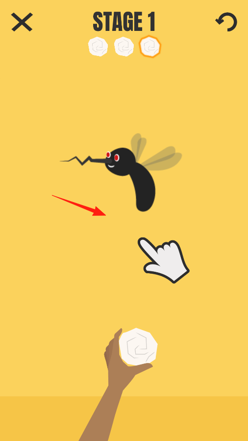 2、第一关里,看到一只蚊子在飞,手里拿着纸团,按照提示,瞄准蚊子,把纸团扔过去,尝试击中蚊子,完成消灭虫子的任务。