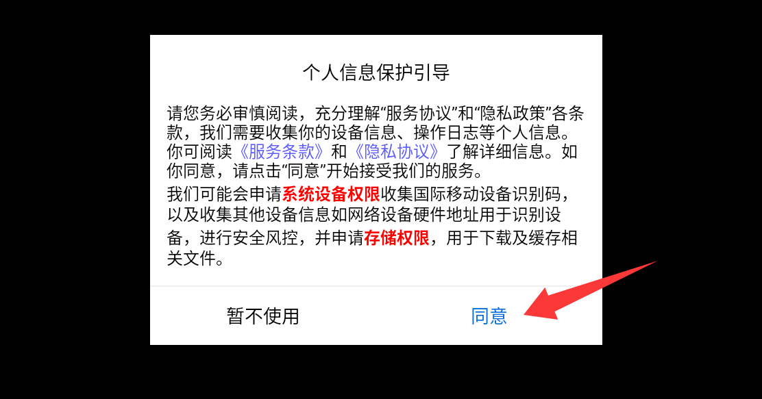 1、点击个人信息保护引导里的同意并继续。