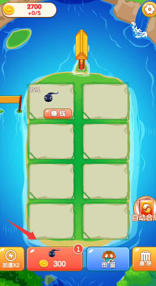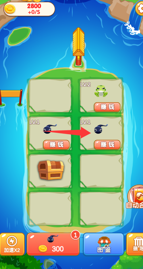 3、进入到游戏界面,点击红色箭头的小蝌蚪放两条出来。
