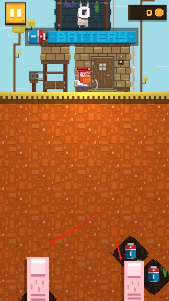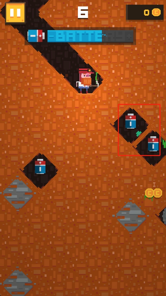 1、开局我们操作角色挥动工具向下挖矿,规划路径时优先朝着药瓶方向挖,获取道具维持生存与能力。