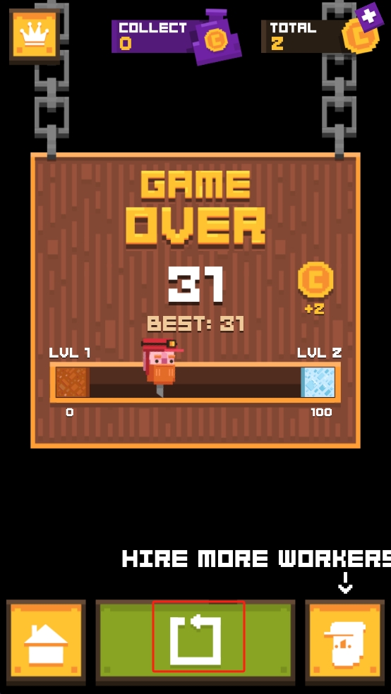 3、若角色生命值耗尽,触发GAME OVER界面,显示得分、金币等,点击绿色中间的重置按钮,重新开始挖矿挑战。