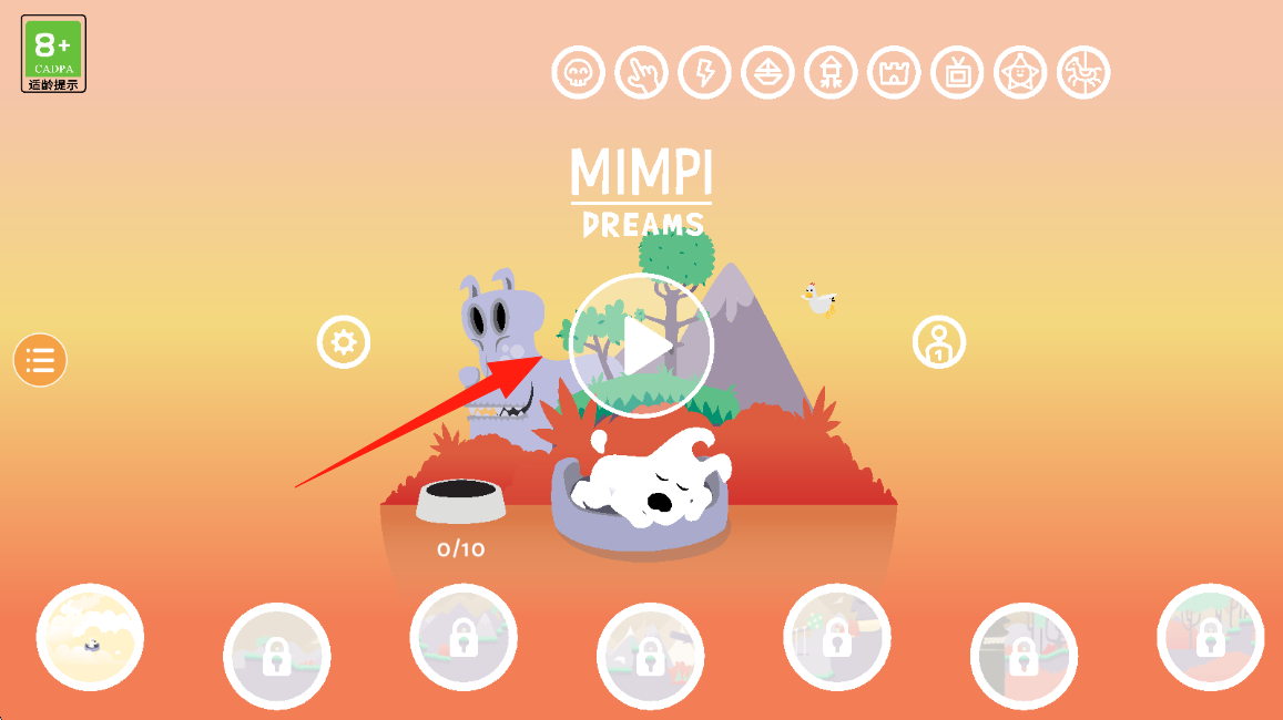 1、点击游戏主界面中间的播放按钮,进入MIMPI-DREAMS游戏,开启小狗的梦境冒险。