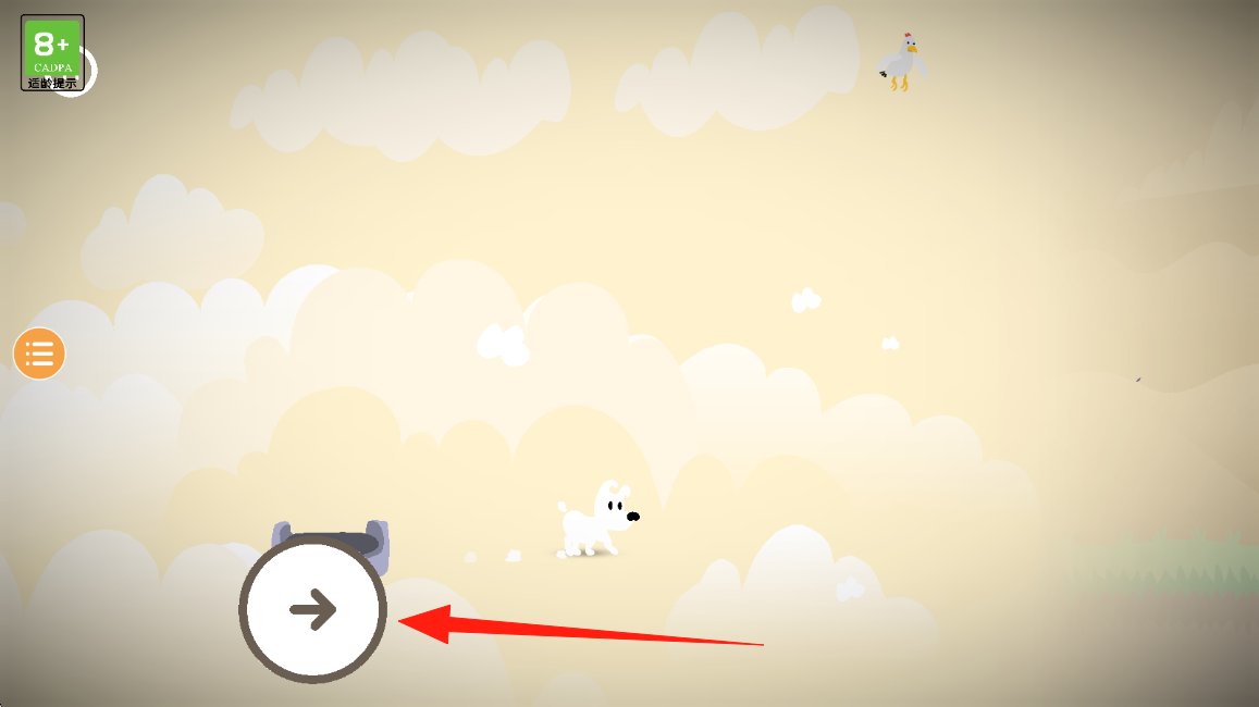 2、在云朵场景,点击左下角箭头按钮,控制小狗向右移动,探索新区域,点击快速走。