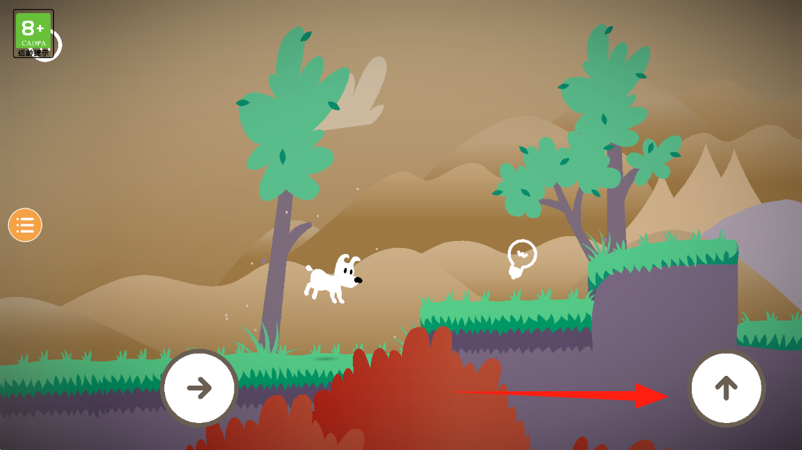 3、遇到草地山坡时,点击右下角向上箭头,让小狗跳跃爬坡,收集灯泡道具推进关卡。
