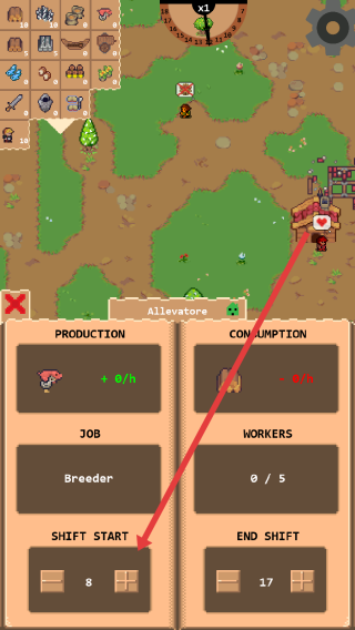 3、在农场建筑的界面中,点击SHIFT-START按钮,启动养殖班次,让工人开始动物养殖的生产工作。
