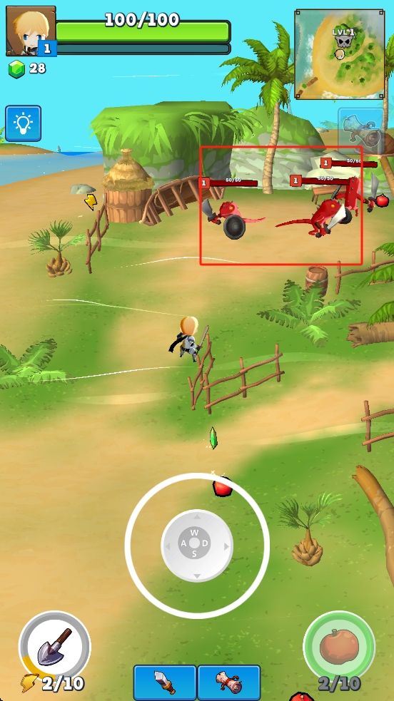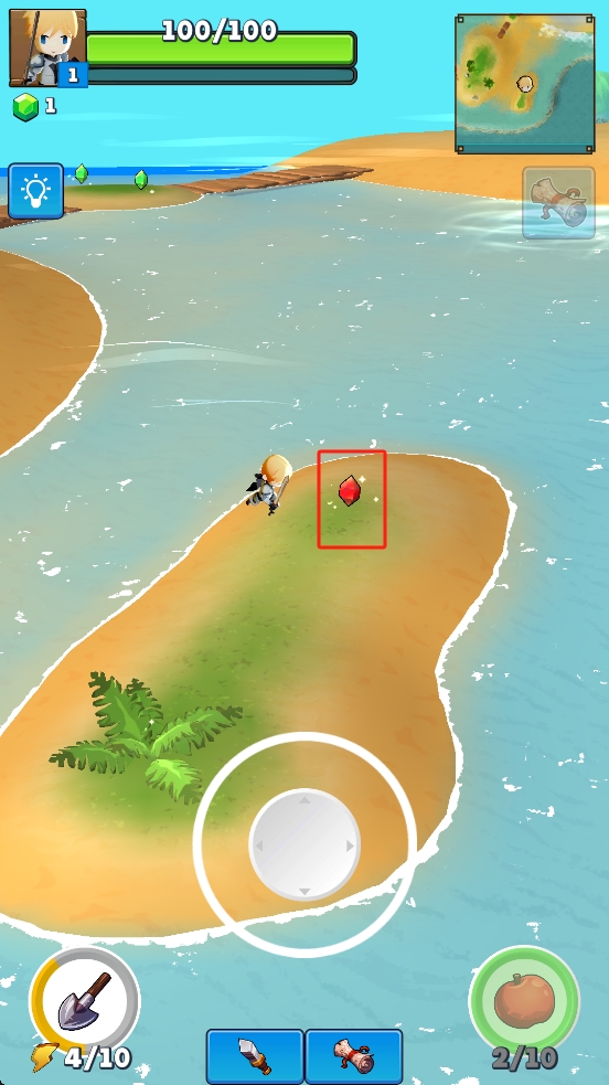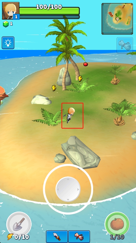 1、操控角色在岛屿移动,留意界面上方血量、道具栏,收集地面黄色问号道具,遇到红色果实也可采集。