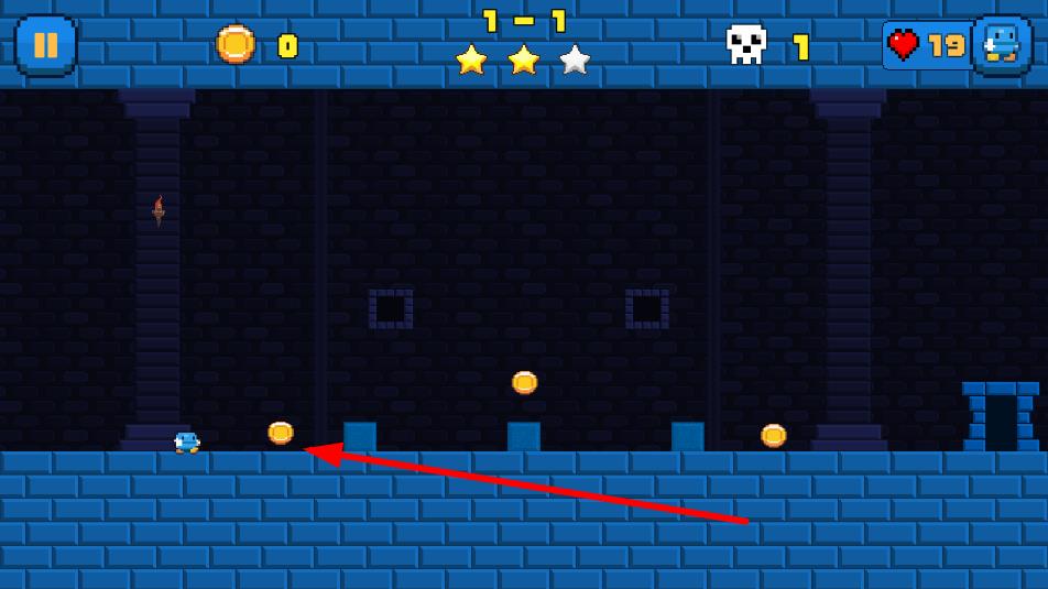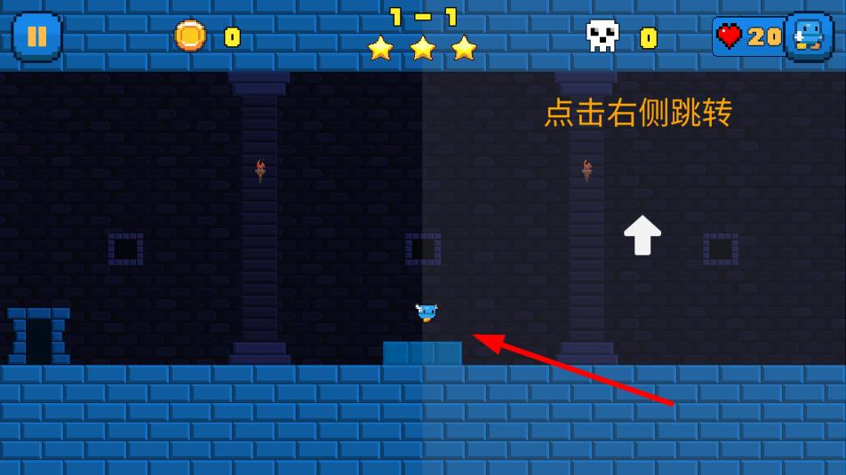 1、进入游戏后熟悉半自动控制,左屏点击暂停、右屏点击触发跳跃,初始地牢场景中尝试跳跃,开启第一关的逃生挑战。