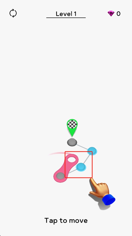 1、根据界面提示,点击粉色的机械部件,借助其带动蓝色节点移动,朝着带有方格旗标识的绿色目标位置行进。