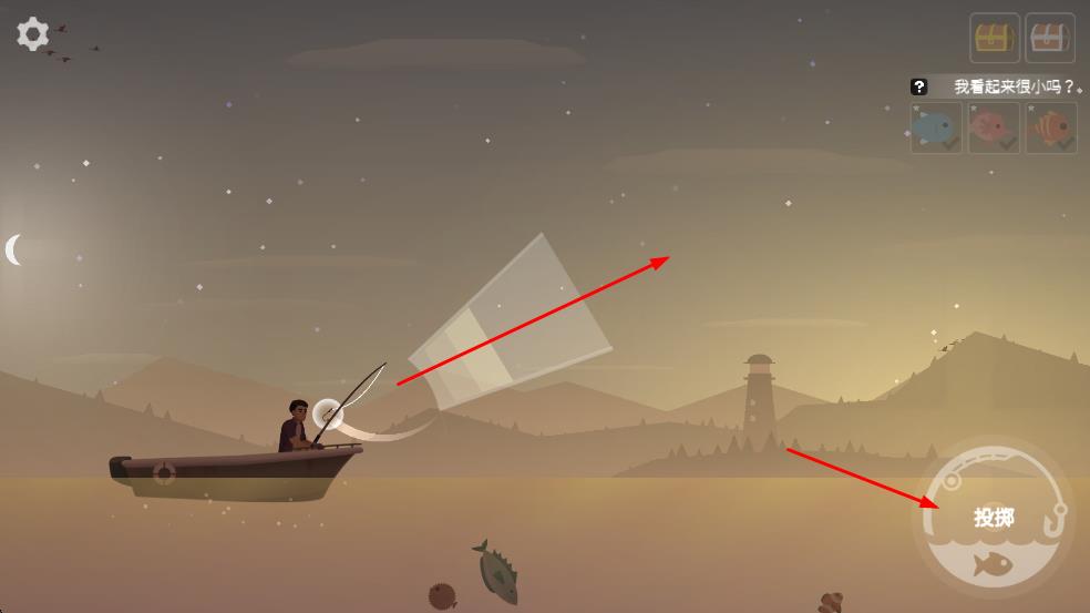 2、长按右侧投掷按钮,调整角度蓄力,释放鱼钩。