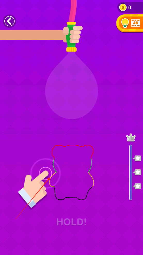 1、按住屏幕控制水流填充容器轮廓,根据轮廓形状调整按住的时长和节奏,让水逐渐填满轮廓,同时留意右侧进度条,把握填充进度。