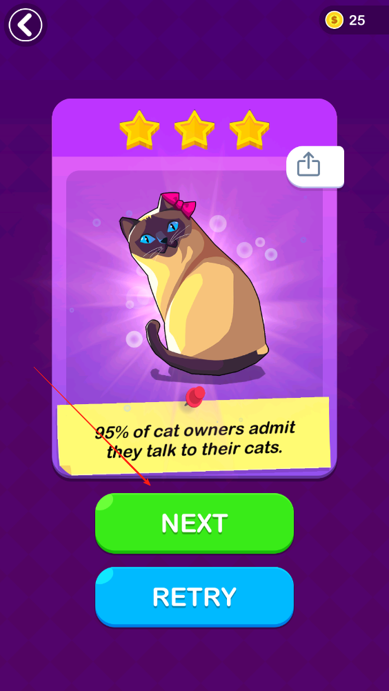 3、成功填满容器后,会显示关卡评价和相关内容,此时可点击NEXT进入下一关,继续挑战不同形状容器的填充,也可选择RETRY重新挑战当前关卡。