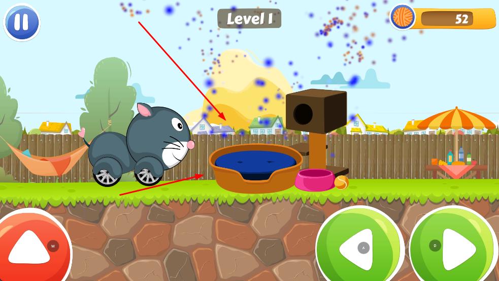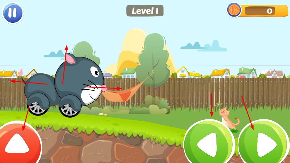 1、通过左下角红色按钮、右侧绿色按钮,操控猫咪汽车在庭院移动,启动关卡探索。