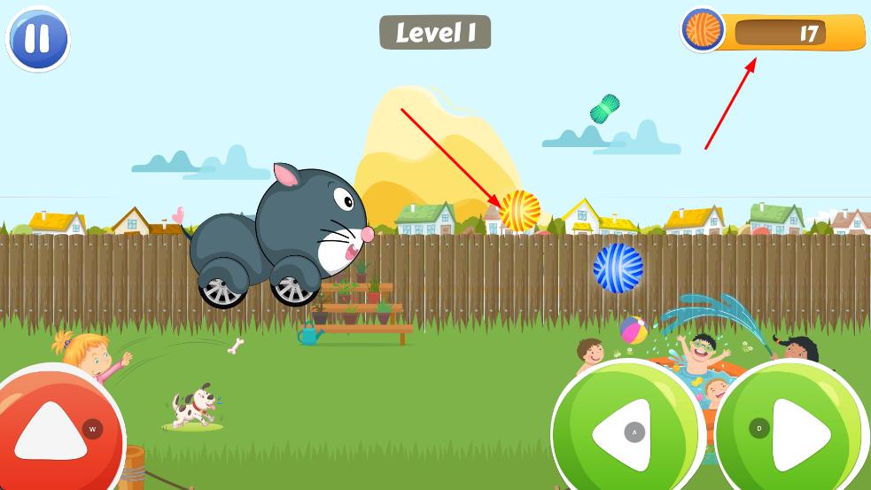 2、收集空中毛线球,提升右上角数值,推进游戏进程。