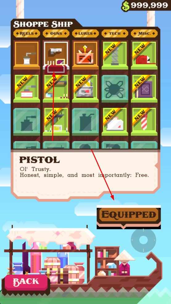 3、进入SHOPPE SHIP商店,选择如PISTOL等道具,点击EQUIPPED装备,提升能力。