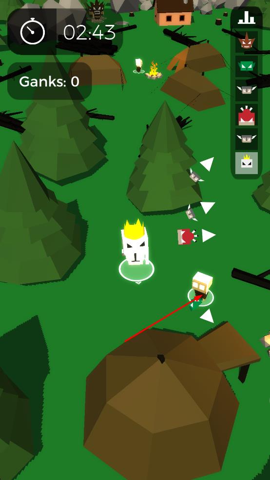 1、进入游戏,操控戴皇冠角色在森林移动,靠近带白色三角标识的敌人,开启战斗对抗。