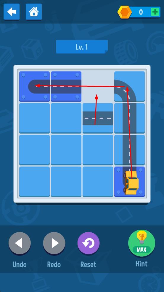 1、进入Lv.1等关卡,拖动道路方块,拼接连贯路线,规划小车行驶路径。
