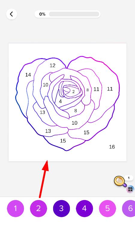 1、进入游戏后,在图案库中浏览海量精选图案,挑选一幅喜欢的点击进入涂色界面,同时熟悉调色板上的颜色和各类填充工具的使用方法。