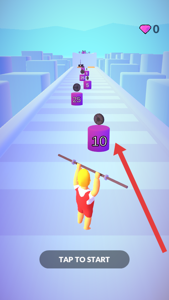 1、点击TAP TO START开跑,左右滑动屏幕,控制角色躲避障碍,优先撞紫色圆柱数字越大越好。