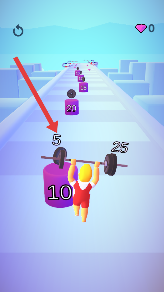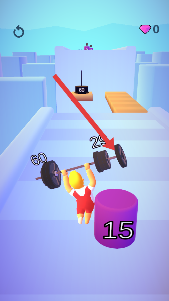 2、遇分岔路选圆柱密集侧,连续撞击圆柱叠加重量杠铃片加圆柱数字,提升得分,凑近黑色圆盘。