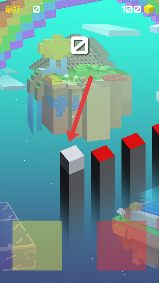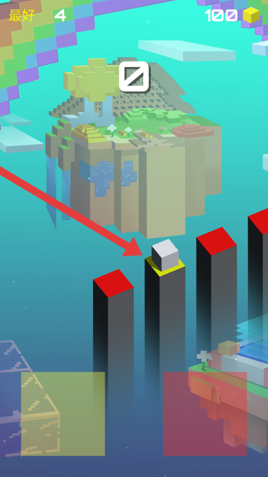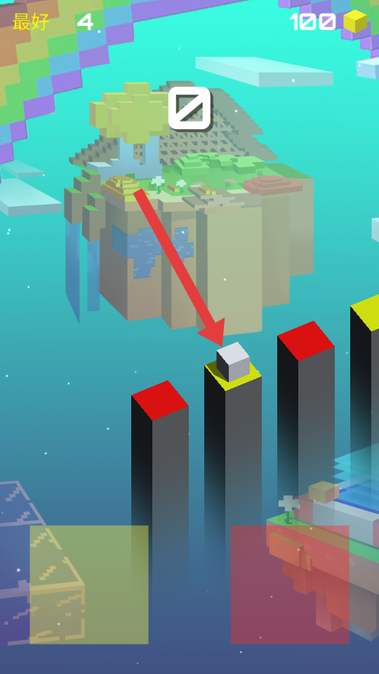 2、遇不同颜色柱顶红、黄,优先跳黄顶可能加分或者助力,避开落空,向悬浮的岛继续推进。