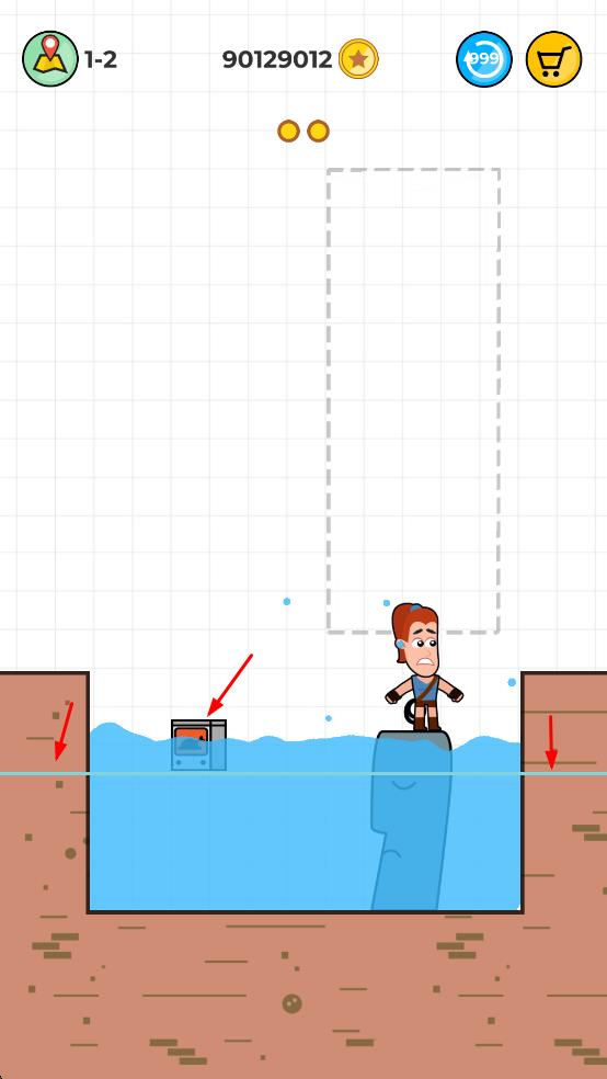 1、指定区域设计水形:进入关卡后,先观察指定画线区域的范围、下方虚线的高度以及小人的位置,然后在区域内用线条勾勒出水的形状,线条需闭合形成可容纳水流的空间。