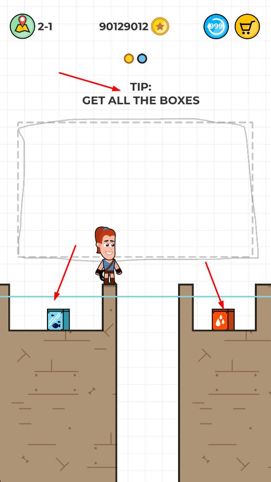 3、进入2-1关卡,遵循GET ALL THE BOXES提示,绘制形状衔接箱子,完成收集目标。