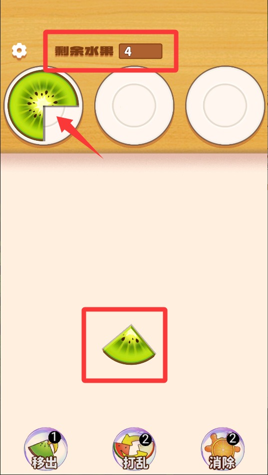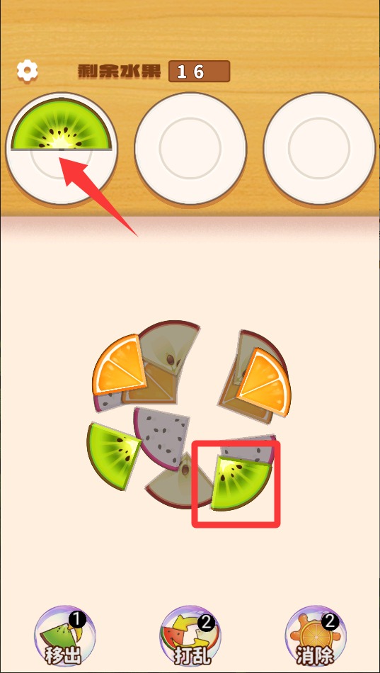 2、看到相同水果切片就拖到盘子里,三个一样的放一起就能消除,注意观察整个棋盘,找能连消的机会。