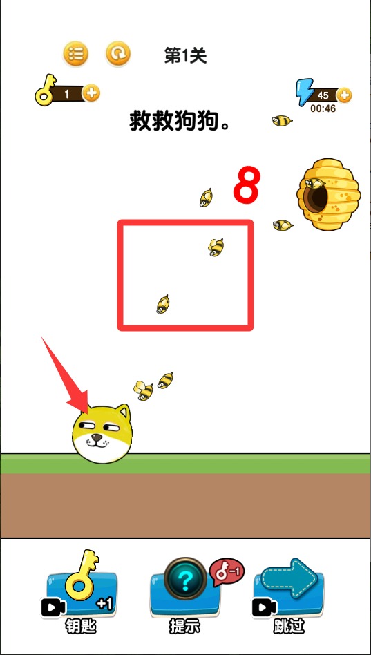 4、成功保护小狗就能过关,点下一关继续玩,后面关卡蜜蜂会越来越多,得想点新招数才行。