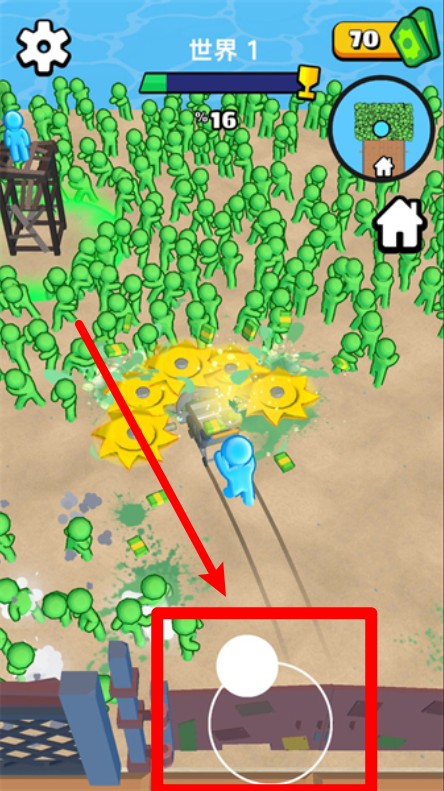 1.拖动屏幕左下角的虚拟摇杆控制角色移动,灵活调整位置以割除大片敌人并收集散落在地面的金币与奖励。