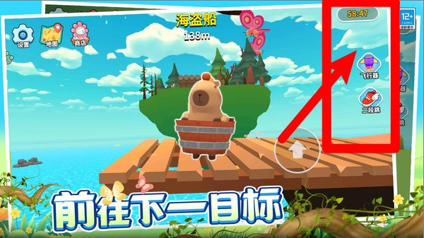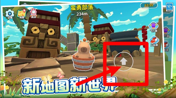 2.右侧功能键:包括飞行器与三段跳技能,能帮助卡皮巴拉跨越高台与远距障碍,在关键时刻提升跳跃高度与前进距离。