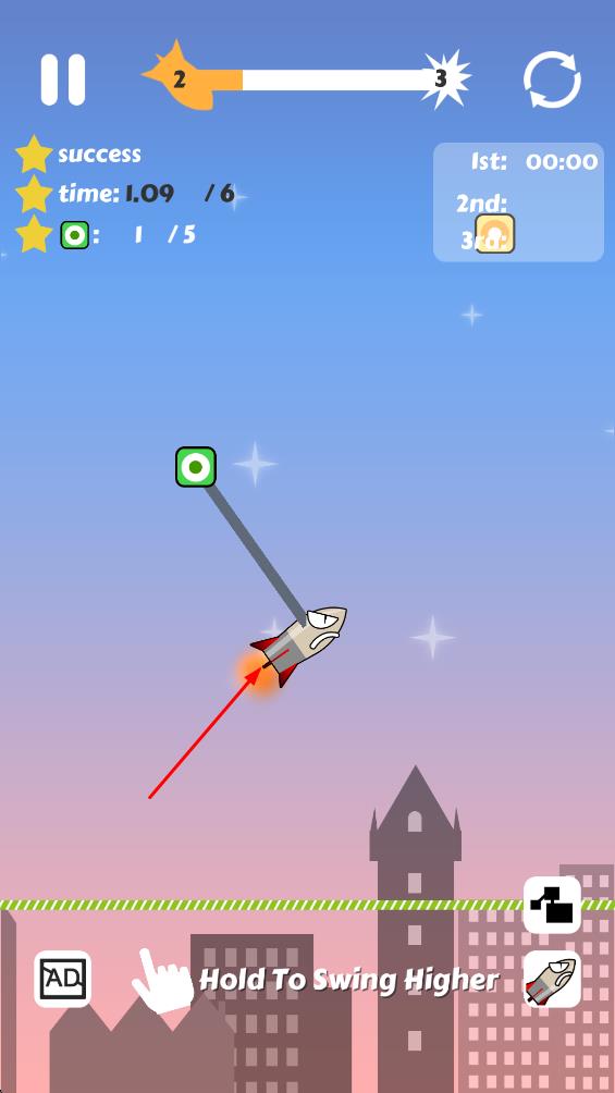 1、长按屏幕,操控火箭借绳索摆动飞行。