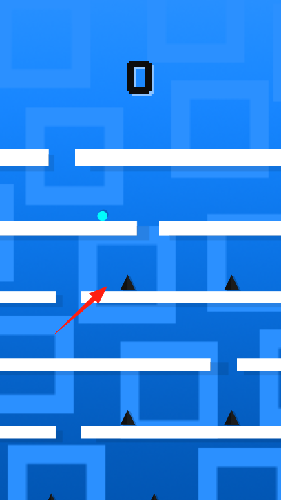 2、可以切换成蓝色的场景,让小球去继续跳跃红箭头,躲开黑色尖刺,跨越平台缺口。