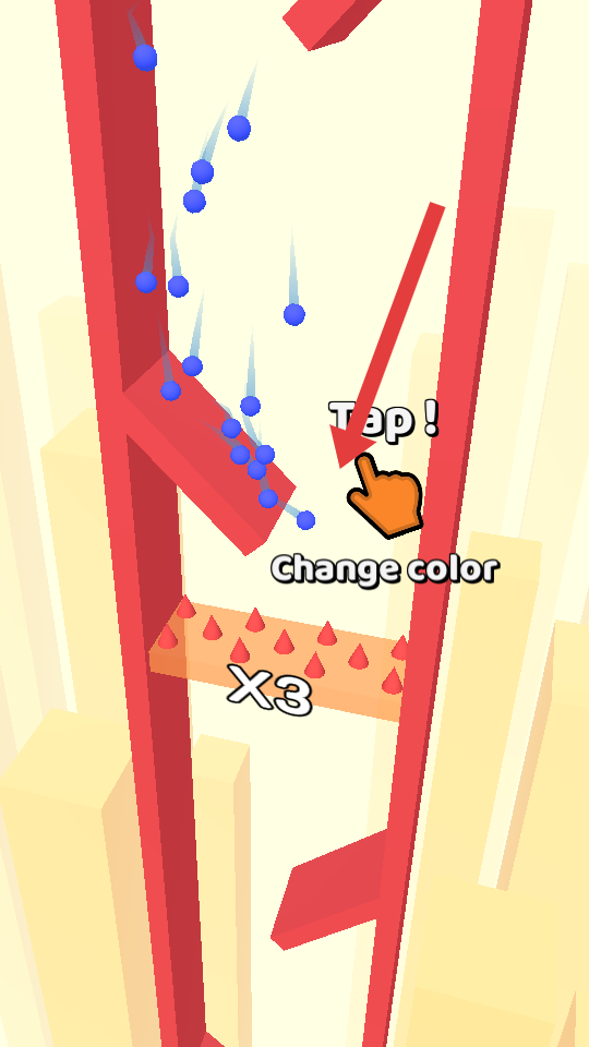 1、游戏开始,看到Tap!Change color提示,点击屏幕切换小球颜色,匹配红色通道,躲避尖刺障碍。