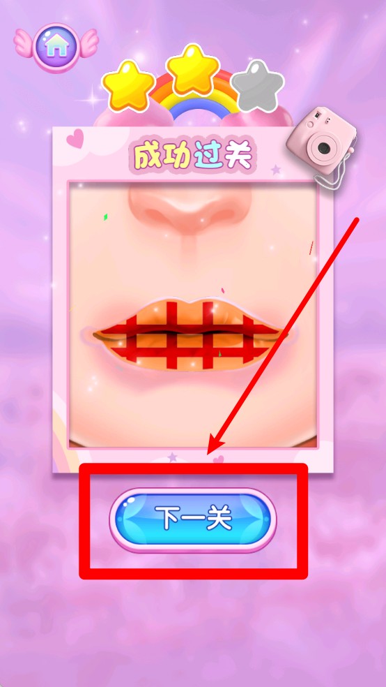 3.完成唇妆后会进入结果页面,根据涂抹效果获得星级评价,点击下一关按钮即可继续挑战新的美妆任务。