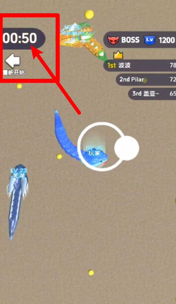 1.倒计时位于左上角,随时掌握本局剩余时间;临近结束请收缩走位,优先吞食安全能量点,避免硬刚导致失误被淘汰。
