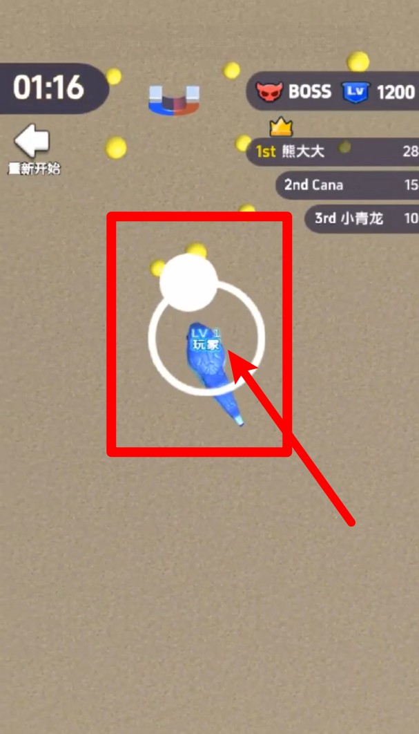 2.圆形虚拟摇杆负责转向与加速,保持蛇头内切外扩的弧线走位;尽量先吃到磁铁等增益,扩大吸附范围,高效成长拉开优势。