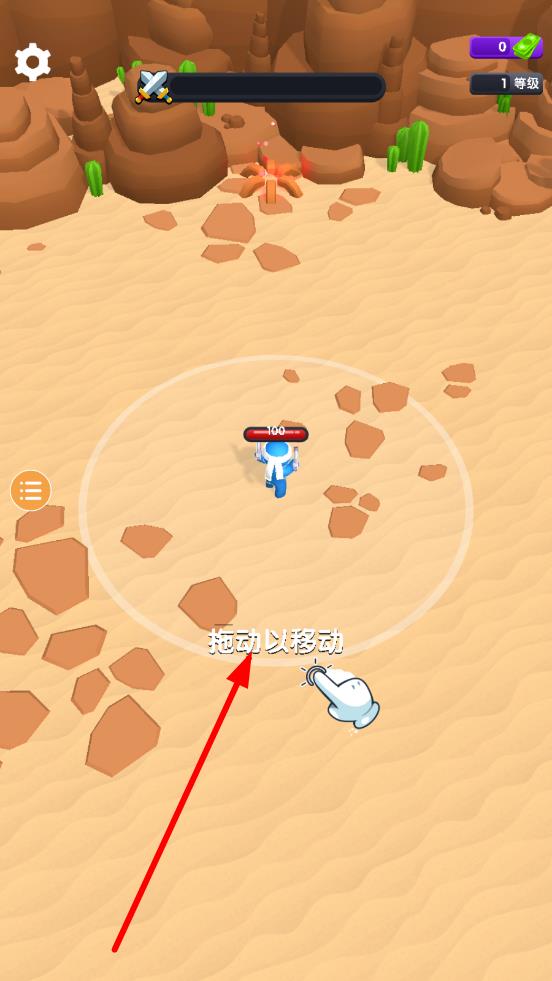 1、进入关卡,拖动屏幕操控角色移动,熟悉荒漠地形与操作手感,目标指向红色敌人,规划首波战斗的接近路线。