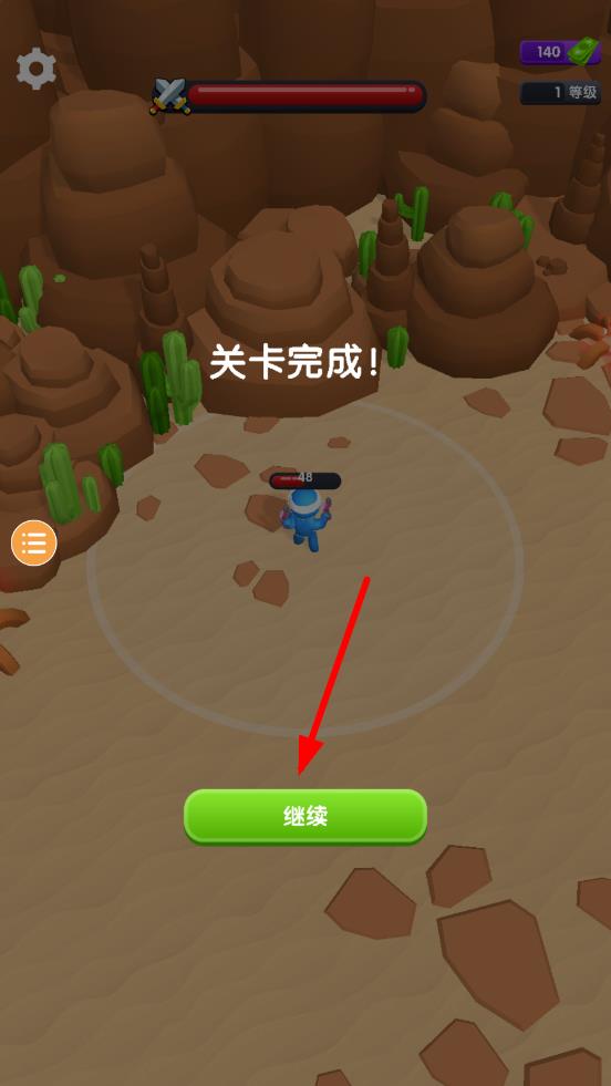 3、击败所有敌人后,屏幕显示关卡完成,点击继续进入下一关,挑战更密集的敌人阵容与复杂地形,突破沙漠战场的层层考验。