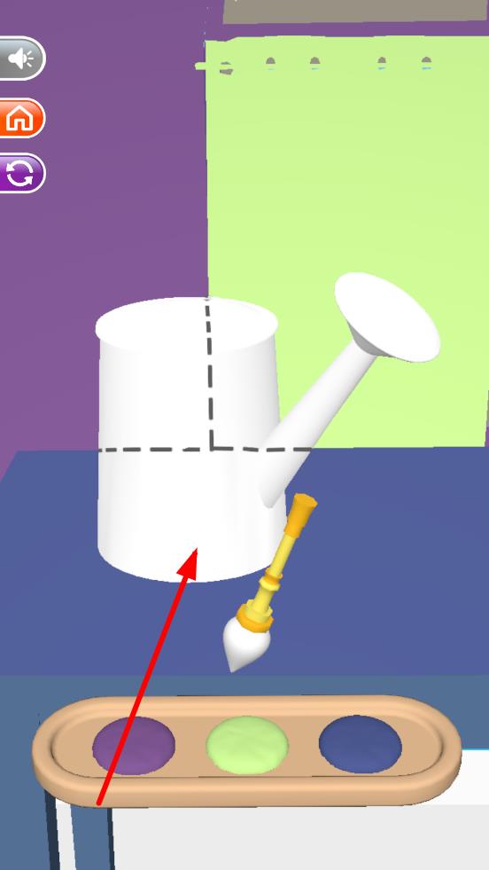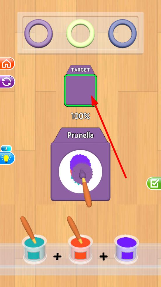 1、进入关卡,观察目标色,分析基础染料组合,用画笔蘸取染料,在调色区混合,调整的颜色需要逼近目标色。