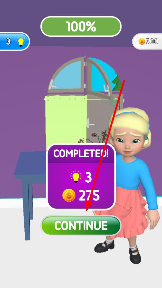 3、染色与目标色达100%匹配后,客户会进行验收,弹出完成提示,点击CONTINUE进入下一关,解锁新物品和新颜色染料。