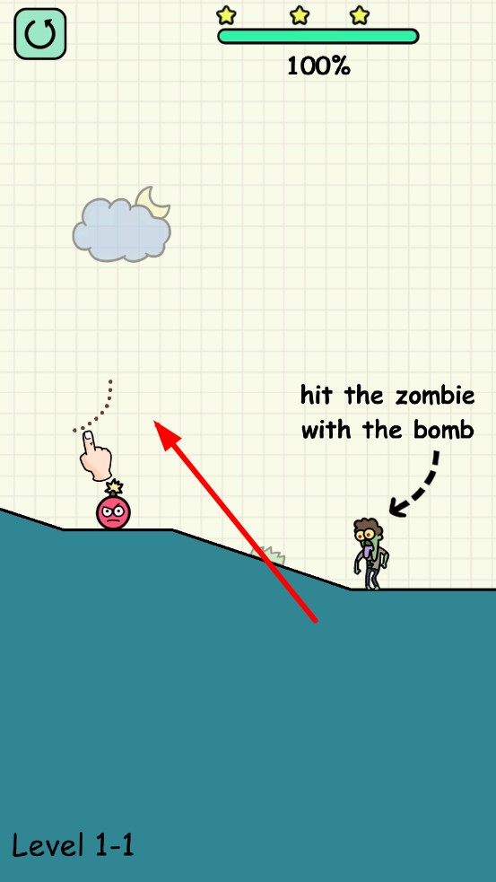 1、进入关卡,先观察僵尸分布与地形障碍,长按屏幕拖出虚线弹道,松开后,轨迹会压着炸弹。