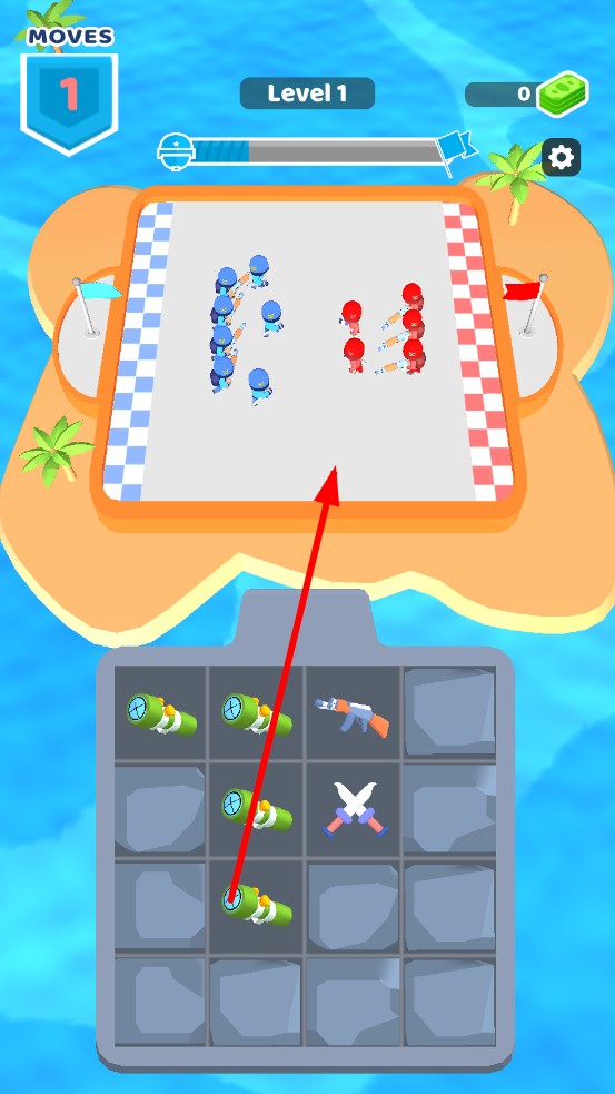 3、消灭所有红色敌军并占领战场旗帜,通关后领取金币奖励,用于解锁新武器卡牌或升级兵种属性,推进下一关卡,挑战更复杂关卡。