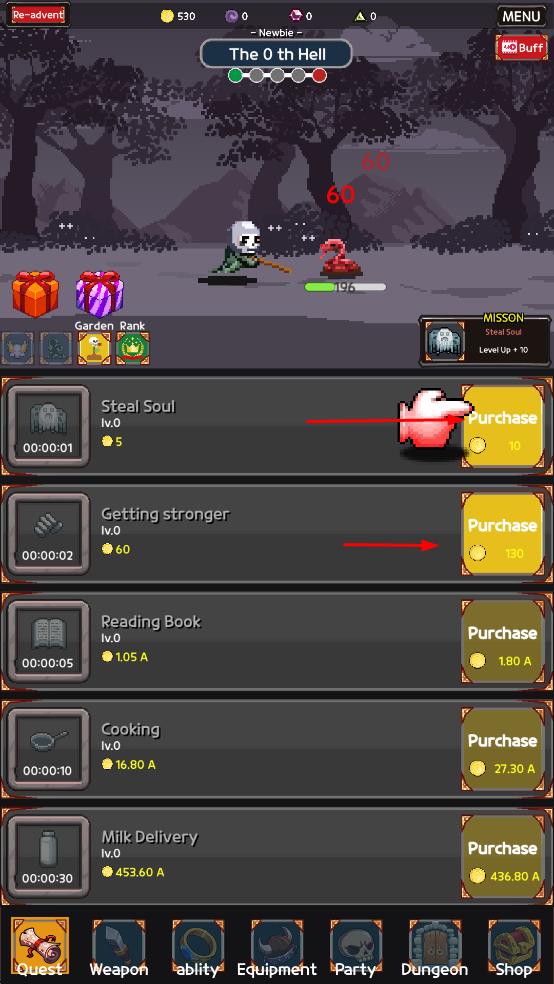 1、在技能列表消耗金币购买或升级,解锁战斗能力,助力地牢冒险。