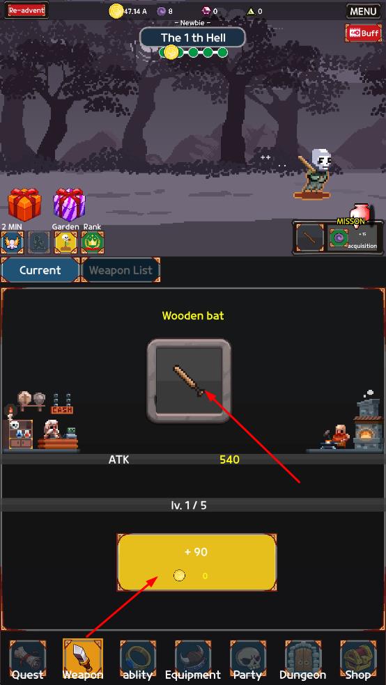3、进入Weapon界面,选择武器,消耗金币提升等级,增加攻击力,强化战斗实力。