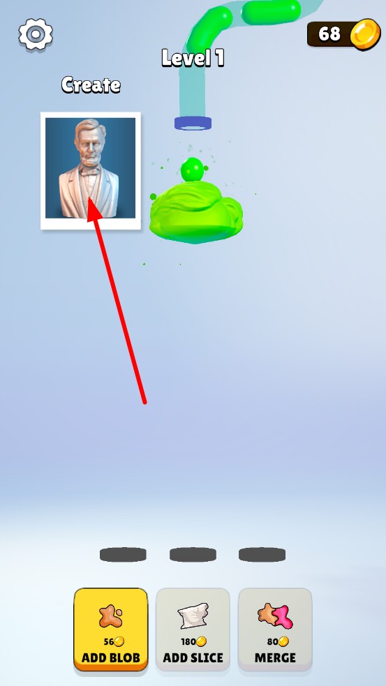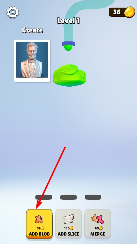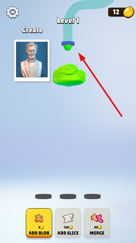 2、消耗金币点击ADD BLOB添加泥块扩大体积,ADD SLICE切割塑造轮廓,MERGE合并泥块,加速形态成长。