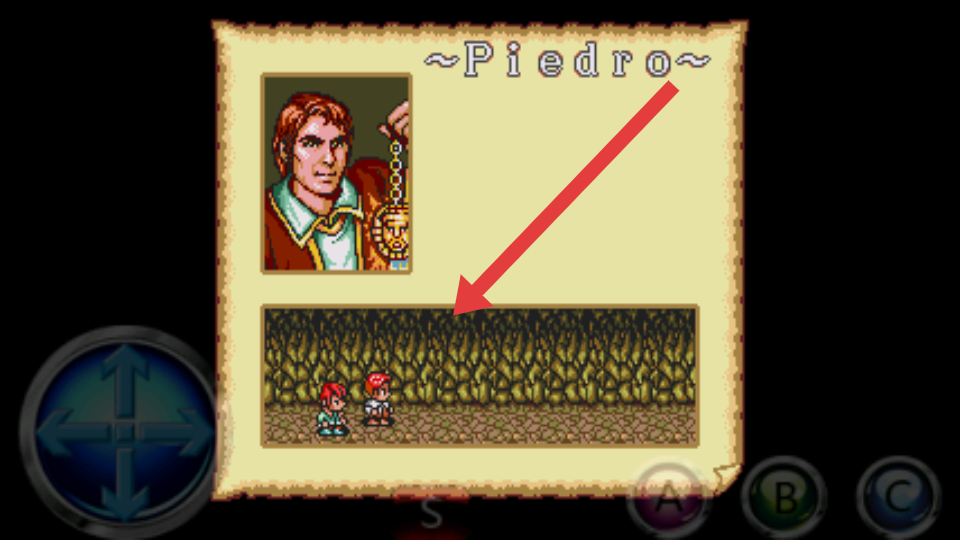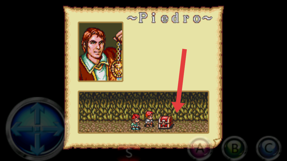 2、进入Piedro洞穴场景,用方向键控制移动,沿路径探索,遇宝箱如红箱优先开启,获取道具装备,提升能力。