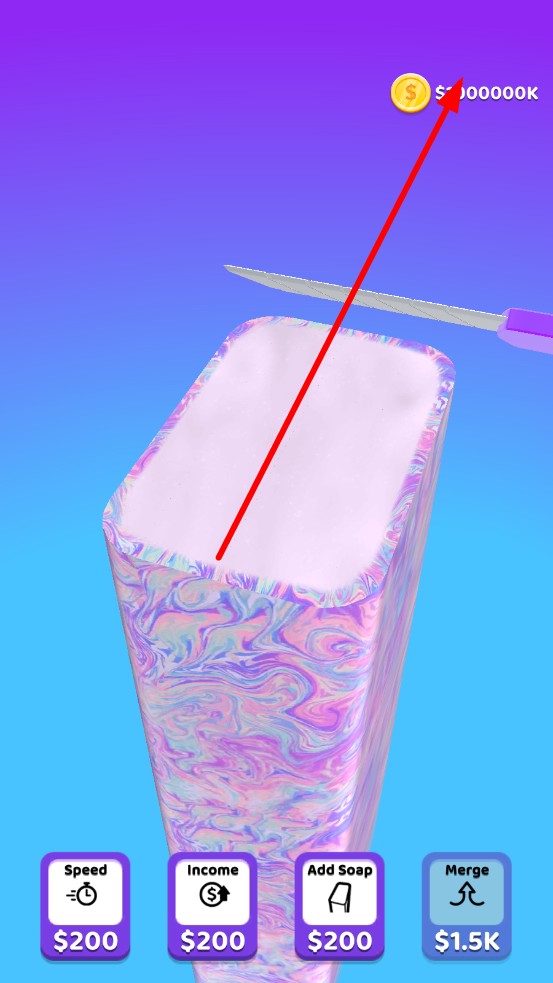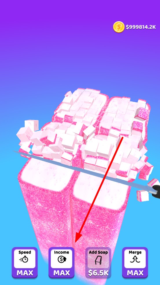3、消耗金币升级Speed,加快切割频率、Income,提升单刀收益、Add Soap,增加同时切割的肥皂数,或点击Merge合并肥皂,解锁新造型。
