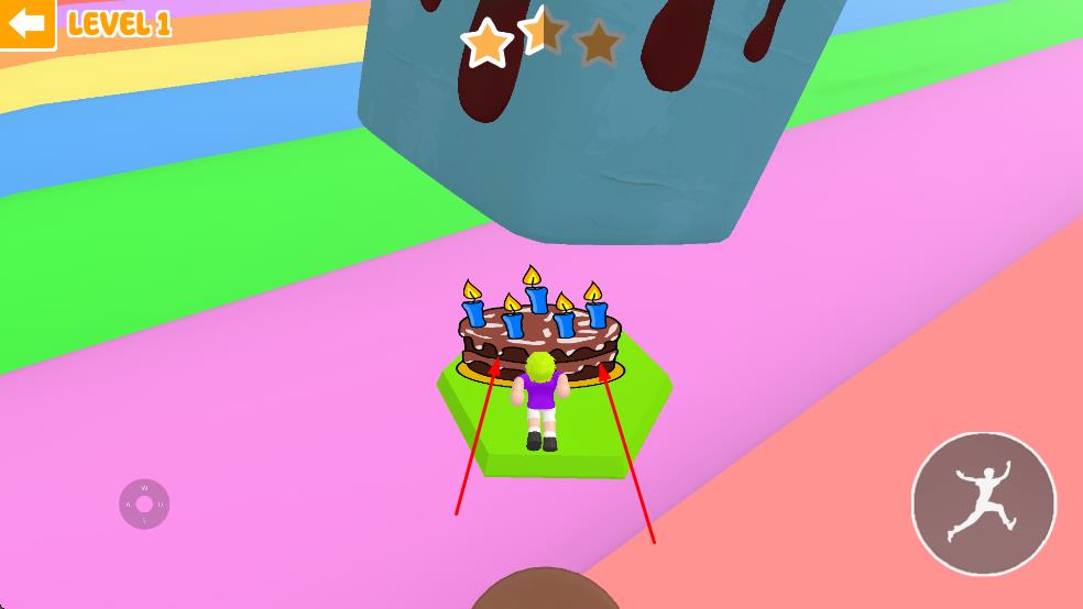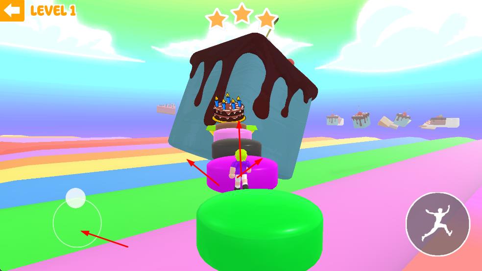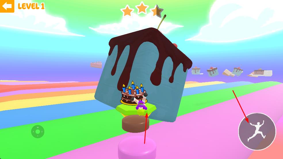 2、点击右侧跳跃按钮,跨越圆台障碍,逐步接近目标生日蛋糕,冲击三星评价。