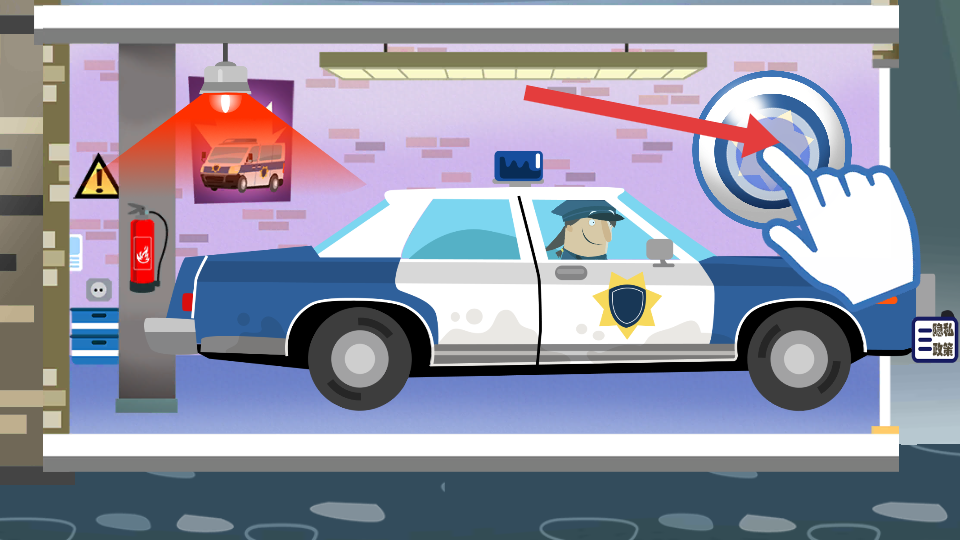 1、车库场景点击右侧圆形按钮,启动警车出发,熟悉虚拟按键或滑动控制方向,避开相关的障碍。