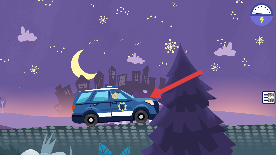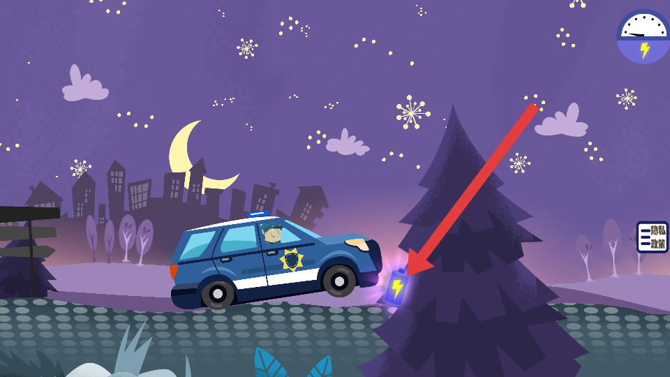 3、夜晚场景中,按道路标识推进,遇到能量道具必捡,积累能量解锁新警车或加速技能,探索新地图。